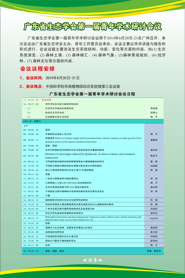广东省生态学会第一届青年学术研讨会议将于2014年6月20日-21在我园综合实验楼第三会议室召开。本次会议由广东省生态学会主办,青年工作委员会承办。会议主要以学术讲座与报告的形式进行。会议议题主要涉及生态系统结构、功能、变化等方面的内容,如(1)生态系统演变、(2)森林土壤、(3)森林碳汇、(4)森林气象、(5)森林景观规划、(6)经济林、(7)森林文化等方面的内容。