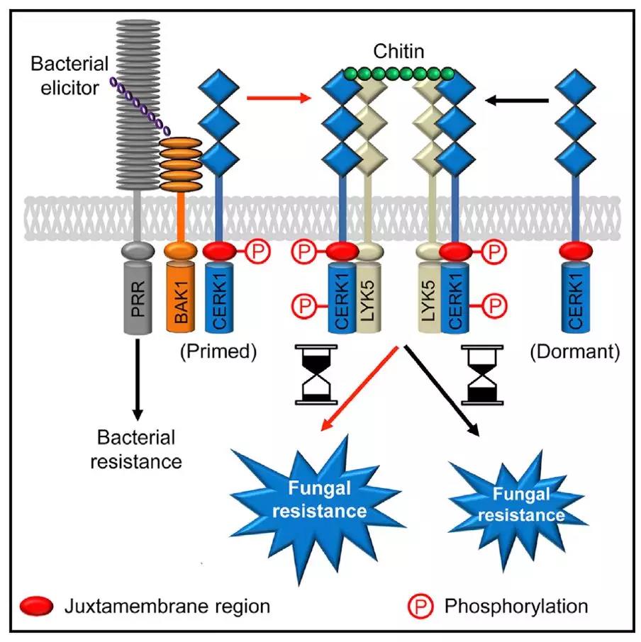 图 植物通过BAK1调控的CERK1近膜区磷酸化获得真菌抗性