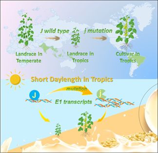 值得一提的是,2017年孔凡江/刘宝辉研究团队在Nature Genetics上先期报道了大豆长童期 (Long Juvenile)关键基因J的克隆及进化机制研究成果“Natural variation at the soybean J locus improves adaptation to the tropics and enhances yield”。研究发现, J基因多种功能缺失变异的产生使大豆在短日诱导条件下仍能保持相对较长的营养生长,获得高产,从而突破了大豆在低纬度地区产量极低的限制,使大豆在低纬度(尤其是南美地区)得以快速扩张和推广,改变了世界大豆生产格局(图2)。两篇文章相互补充,不仅进一步完善了以E1基因为关键节点的大豆开花分子调控网络,而且系统阐释了J基因促进大豆低纬度适应,Tof11和Tof12促进大豆中高纬度适应的多基因进化机制,为大豆品种适应性和产量分子育种提供了重要的理论依据和应用基础。