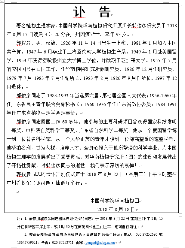 沉痛悼念植物生理学家郭俊彦同志逝世!