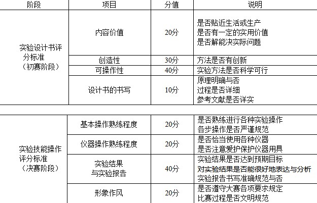 初赛阶段得分为实验设计书评分,决赛阶段得分为决赛当日实验过程中的操作技能及实验记录、结果、报告等评分。