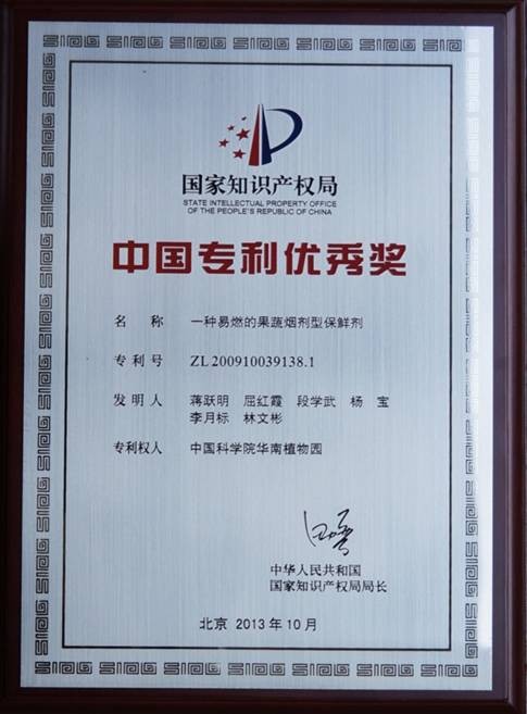 1月17日,华南植物园专利“一种易燃的果蔬烟剂型保鲜剂”(发明人:蒋跃明、屈红霞、段学武、杨宝、李月标、林文彬;专利号:ZL 200910039138.1)获得了第十五届中国专利优秀奖。