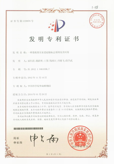 3月13日获悉,由华南植物园屈红霞、蒋跃明等科研人员完成的“一种荔枝果实衰老起始标志基因及其应用”获得国家发明专利授权(专利号: ZL 201210461058.7)。
